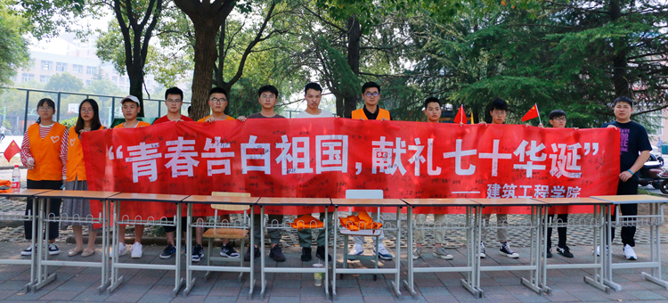为积极响应“青春告白祖国”活动的号召,同时加强建工学子的爱国主义教育,建筑工程学院于26日在学校恬园餐厅门口举行“青春告白祖国,献礼七十华诞”签字活动。
