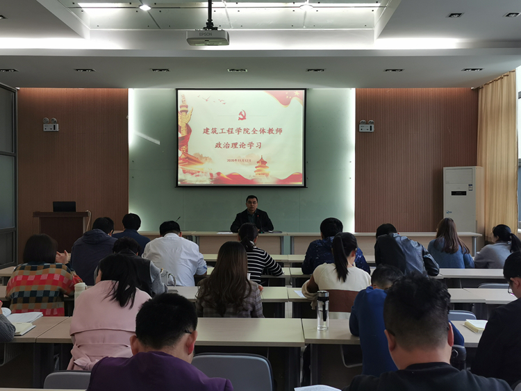 11月12日下午,建筑工程学院召开中国共产党第十九届中央委员会第五次全体会议精神专题学习会,学院党总支负责人主持会议并作学习宣传贯彻全会精神工作部署,全体教职工参加了学习会。