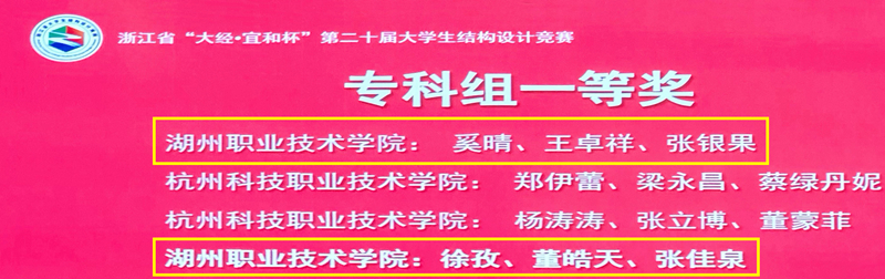 6月5日,浙江省第二十届大学生结构设计竞赛在杭州科技职业技术学院落下帷幕,经过紧张的角逐和评选,我校由奚晴、王卓祥、张银果三位同学组成的“独木桥”代表队,以及由徐孜、董皓天、张佳泉组成的“三只小白”代表队分别以专科组第一名和第四名的成绩双双斩获一等奖。与此同时,我校在本次大赛中获得优秀组织奖,“独木桥”代表队还获得了最佳创意奖。这是我校在浙江省大学生结构设计竞赛中连续9届获得一等奖及以上荣誉。