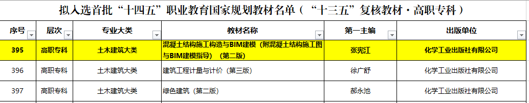 近日,教育部公示拟入选首批“十四五”职业教育国家规划教材名单,经有关单位申报、形式审查、专项审核、网络和会议评审、专家复核等程序,学校建筑工程学院张宪江老师主编的《混凝土结构施工构造与BIM建模(第二版)》教材成功入选首批“十四五”职业教育国家规划教材。