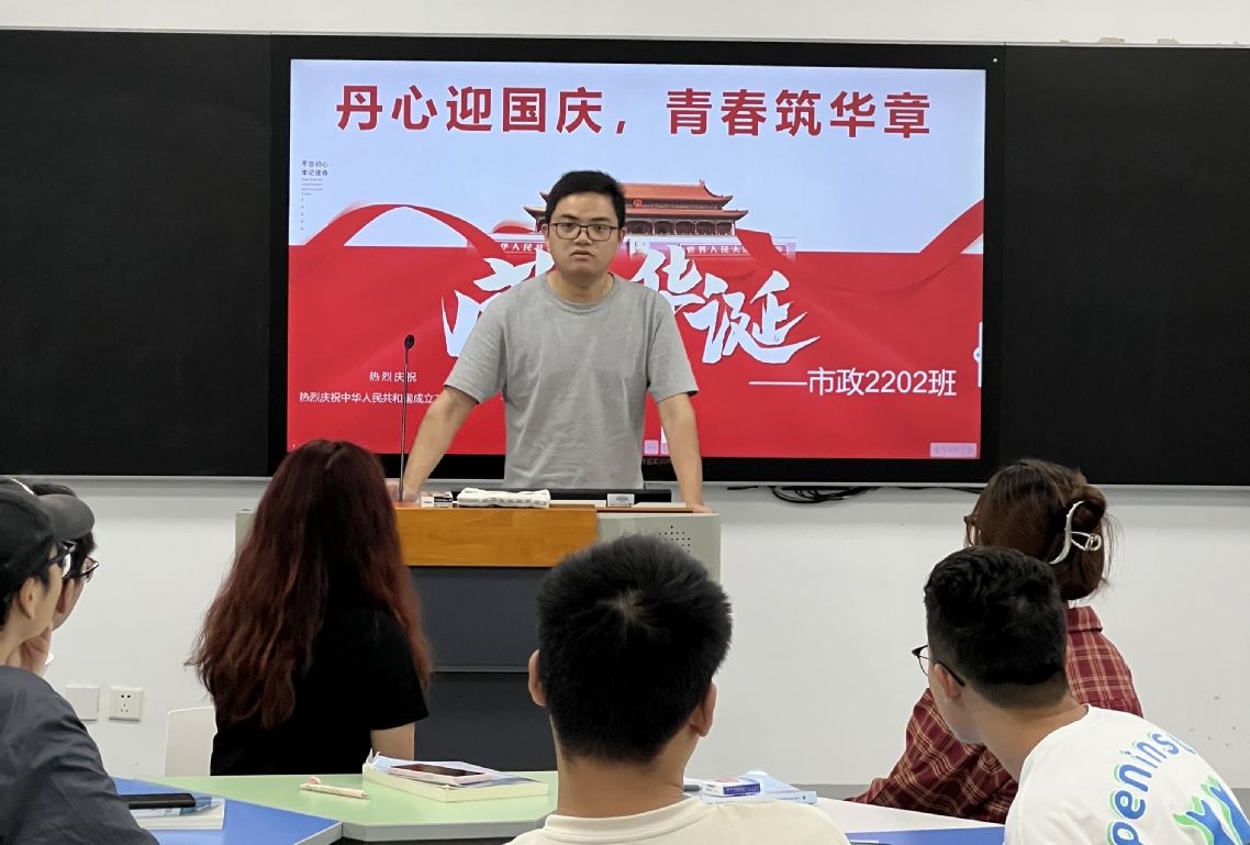 各班通过观看红色电影、召开主题班会、开展建国史知识竞赛等方式为即将到来的祖国母亲的生日庆祝。市政2202班班主任以《让英雄精神在新时代青年中传扬》为题向班级同学介绍了数位革命先烈的故事,同学们纷纷表示,深刻感悟到如今的繁华盛世、国泰民安,正是英雄们负重前行乃至用生命换来的。全体新生在在教官的带领下,通过合唱《我和我的祖国》、《歌唱祖国》、《今天是你的生日》等歌曲为祖国送上祝福。