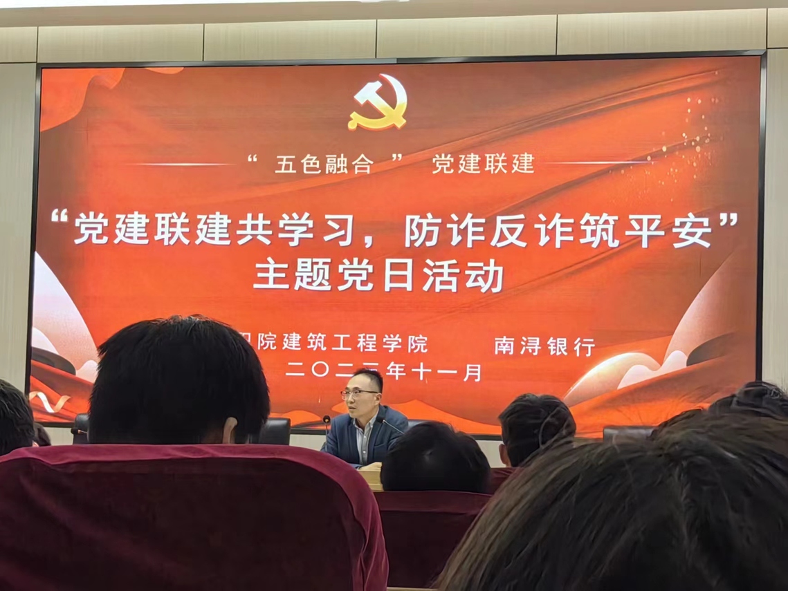 据悉,建筑工程学院与南浔银行为“五色融合”校地企党建联建单位,自联建以来,充分发挥党建联建互补优势,构建“党建联建+反诈”宣传新格局,通过讲座、宣讲、观看视频、下载反诈一哥App等多种宣传方式,切实提高青年大学生反诈防诈能力,形成多维度、多层次、多方参与的校园防诈格局,切实维护学生人身财产安全,筑牢校园网络安全“防火墙”。(文/刘鹏远)