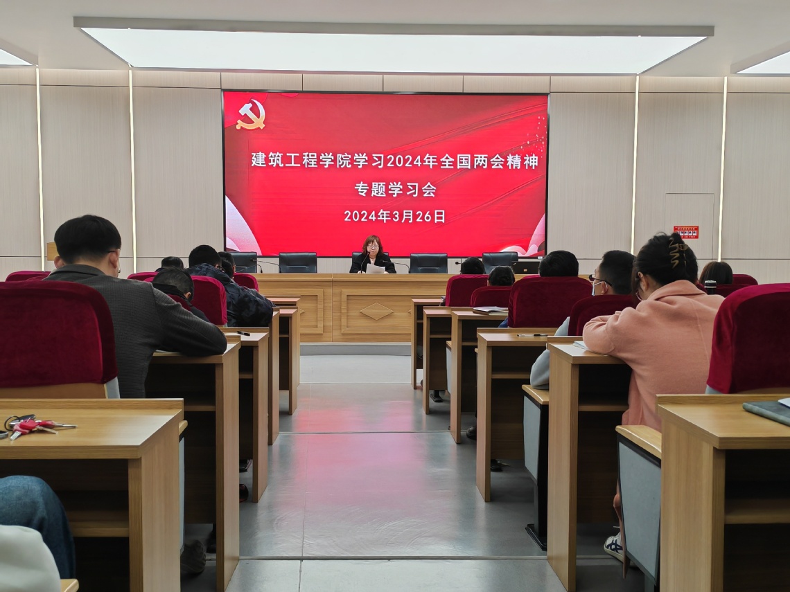 精思细悟汇聚奋进力量,勤恳务实谱写壮丽华章。3月26日下午,建筑工程学院召开学习2024年全国两会精神专题学习会,专题传达学习习近平总书记在全国两会期间的重要讲话和全国两会精神,对学院学习贯彻落实全国两会和省、市两会工作进行安排部署,号召全体师生高质量做好今年各项工作,落实“三支队伍”建设,助力新质生产力发展。会议由学院党总支负责人主持,学院全体党员参加会议。