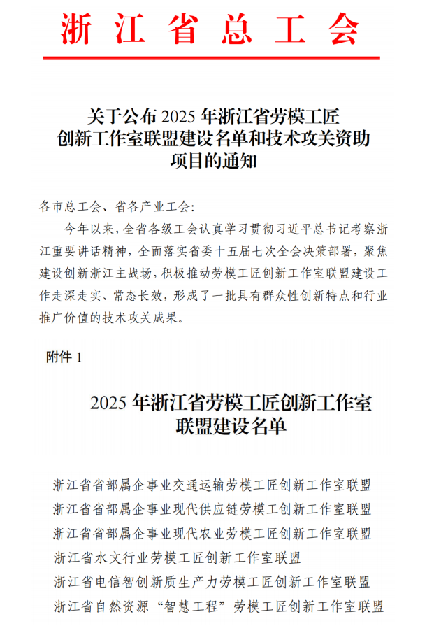 近日,浙江省总工会正式印发《关于公布2025年浙江省劳模工匠创新工作室联盟建设名单和技术攻关资助项目的通知》,由我校建筑工程学院参与共建的浙江省自然资源“智慧工程”劳模工匠创新工作室联盟(以下简称“联盟”),成功入选2025年浙江省劳模工匠创新工作室联盟建设名单,标志着我校在自然资源领域“智慧工程”创新实践与技术攻坚工作获得省级权威认可。